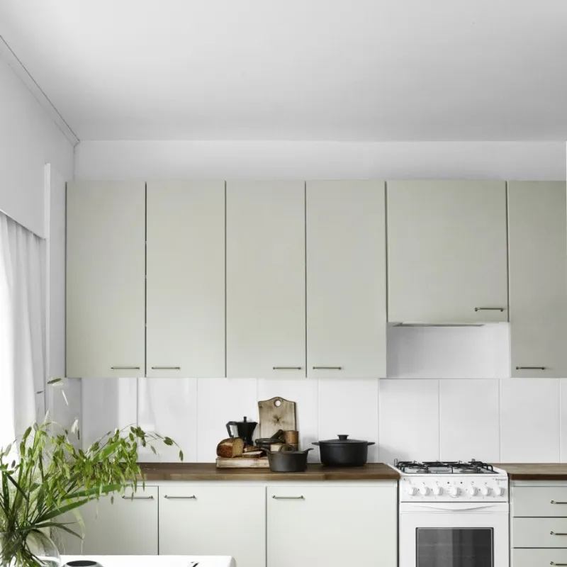 Kun vaalea savi kohtaa hennon vihreän. Vaalea yleisväri, jossa harmaa ja ripaus vihreää vuorottelevat valon leikkiessä tilassa.