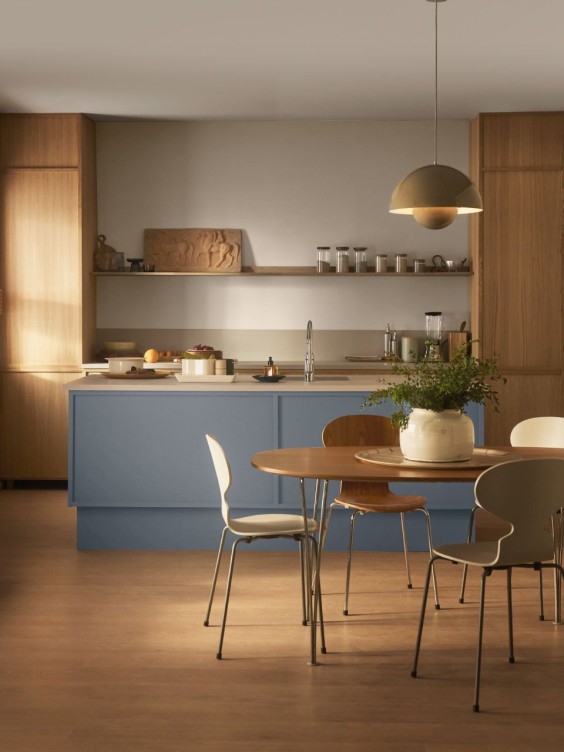 Color Now 2026 -värikokoelmalla sisustettu keittiö on esimerkki ajattomasta, modernista tilasta, jossa kaikki tuntuu huolella valitulta ja rauhalliselta. Tarkoin harkittu tyhjä tila jättää tilaa ruoanlaitolle ja yhdessäololle ystävien ja perheen kanssa. Tasapainoinen värimaailma yhdistettynä puunsävyihin luo kodikkaan tunnelman.