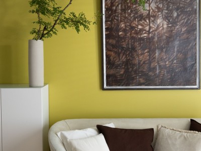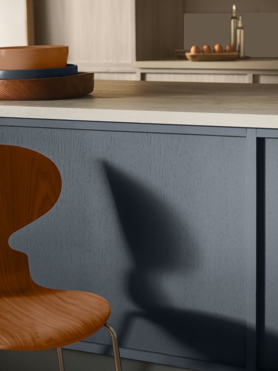 Neutraalit hiekan sävyt ympäröivät tilan lämpimästi, kun taas viileä siniharmaa kaappi luo hienovaraisen kontrastin. Kokeile beigenharmaata J484 Linnaa yhdessä S500 Tyrskyn ja V486 Savikiven kanssa, sekä lisää kontrastia oranssilla V406 Sadonkorjuulla. Jos haluat rohkeutta, tuo tilaan Vuoden Väri, L391 Kameleontti, tilan keskipisteeksi.