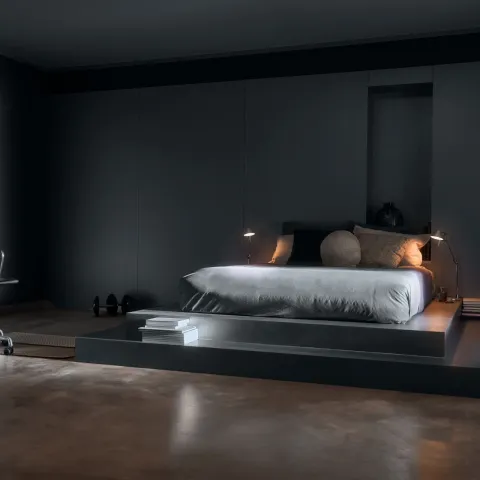 Tämän makuuhuoneen tunnelma on rauhallinen ja hillitty. Syvät harmaat ja laivastonsiniset sävyt luovat intiimin, tyynen tunnelman. Tummissa sävyissä ja kosketeltavissa materiaaleissa on hiljaista dramatiikkaa.