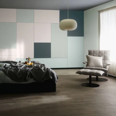Tässä makuuhuoneessa murretut pastellit, lempeät vihreän sävyt ja syvät kontrastit tuovat tilaan rauhallista energiaa ja hienovaraista eleganssia. Luonnonvalo, pehmeät tekstiilit ja modernit muodot luovat kokonaisuuden, joka huokuu kodikasta seesteisyyttä.