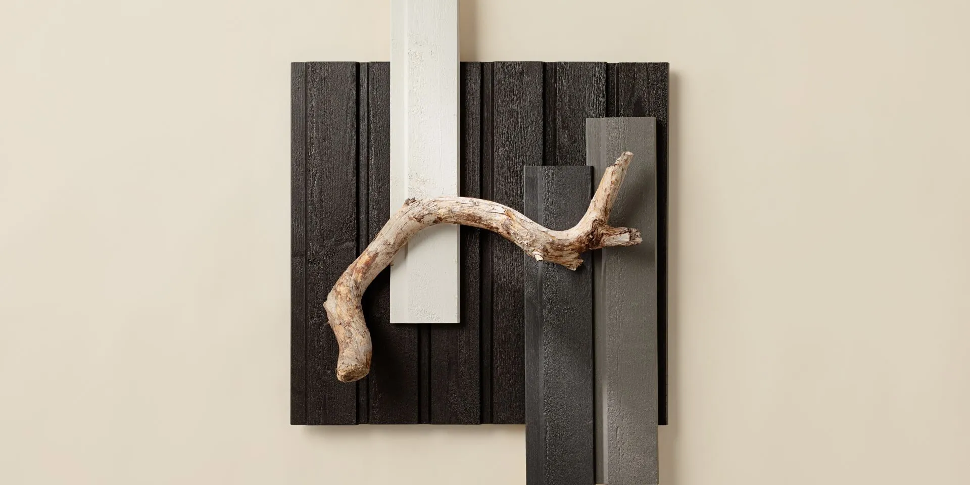 Väriyhdistelmässämme ovat mukana modernin tyylin perusvärit musta D129 Korppi, jota pelkistäjä käyttää vain katossa ja vaikkapa ikkunanpuitteissa. Mikäli kontrasti halutaan hieman pehmeämmäksi, valitaan valkoisen pariksi tumma siniharmaa Q859 Myrskylintu. Vaalea harmaa Q802 Haikara sopii esimerkiksi sokkeliin, jolloin se on hieman seinän väriä tummempi tasaa rakennuksen värien suhteita.