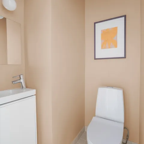 Usein WC jää kodin sisustuksessa sivurooliin, mutta tällä kertaa se on saanut oman näyttämönsä. Seinät on maalattu Hiekkakivellä, mutta todellinen yllätys löytyy katosta, johon Nocturne vangitsee katseen dramaattisuudellaan. Kesäisen yötaivaan sininen Nocturne tuo tunnelmaa ja kehystää tilan uudella tavalla. Ja näin pieni WC:kin on persoonallinen osa kodin värinkerrontaa. Kokonaisuus on täsmälleen sitä, mitä hyvä sisustus on: toimiva, kaunis – ja hiukan yllättävä.