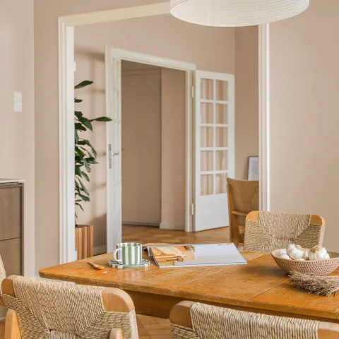 Kun sama sävy toistuu eri tiloissa, koti hengittää yhtenäisesti. Tässä kodissa sekä olohuone että keittiö saivat sävykseen X463 Hiekkakiven. Se kuljettaa katsetta ja rytmittää tilaa saamalla keittiön tuntumaan avaralta ja olohuoneen levolliselta. Hiekkakivi on sävy, joka säilyy ajattoman kauniina vuosia.