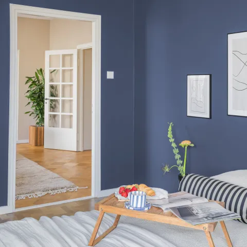 Syvänsininen N348 Nocturne tuntuu samaan aikaan ylelliseltä ja maanläheiseltä. Se saa puupinnan lämpimän sävyn korostumaan, valkoisen kirkastumaan ja mustavalkoiset sisustuselementit erottumaan edukseen. Taulujen ohuet viivat ja selkeät muodot nousevat upeasti esiin yötaivaan tummansinistä vasten. Tämä sävy ei tarvitse paljoa ympärilleen, sillä se on jo itsessään upea sisustuselementti.
