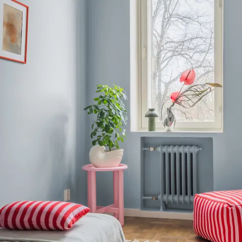 Hennon utuisa K498 Valkama kohtaa vierashuoneessa vaaleanpunaisen pöydän, kujeilevat punavalkoraidalliset tekstiilit sekä graafisen maton. Seinien lisäksi myös vanha patteri sai uuden maalipinnan.