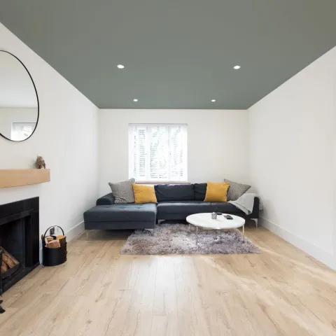 Katon maalaaminen tummemmalla sävyllä kuin seinät luo vaikutelman matalammasta tilasta. Siksi se on hyvä ratkaisu korkeisiin tai suuriin tiloihin, jotka voivat tuntua kalskeilta. Katon maalaus on helppo tapa lisätä huoneeseen väriä ilman, että väri tuntuu liian hallitsevalta. Tämä maalaustekniikka on täydellinen valinta esimerkiksi suureen ja korkeaan olohuoneeseen tuomaan tilaan kodikkuutta.