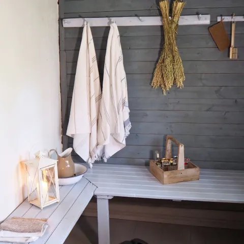 Hirsiseinä oltiin käsitelty jo aiemmin Supi Saunavahalla sävyssä 208A Metsälato. Sävytettävä Supi Saunavaha on hyvä valinta saunan ja pukuhuoneen puupintojen käsittelyyn, sillä se imeytyy puuhun ja antaa puulle luonnollisen kauniin, silkinhimmeän suojan. Lattialaudat olivat puolestaan saaneet edellisenä kesänä uuden pinnan Betolux akva-lattimaalilla sävyssä G487 Batisti.