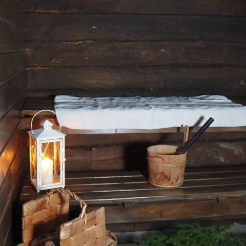 Lopputuloksesta tuli todella tunnelmallinen! Saunan lauteet saivat uuden ulkonäön todella helposti ja nopeasti. Keltaisuus vaihtui tummaan pehmeään ruskeaan, joka sopii täydellisesti yhteen vanhan hirsiseinän kanssa.