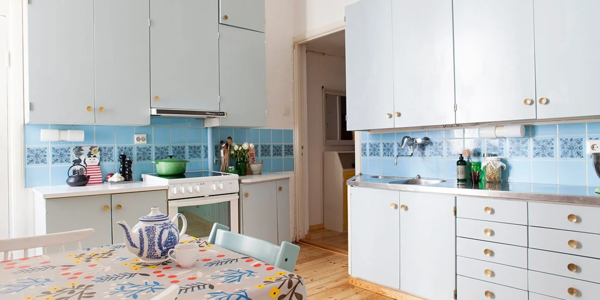 Karin käsitteli vanhat keltaiset kaapinovet puolihimmeällä Helmi-kalustemaalilla, sävynä vedensininen Salaisuus X438. Helmi-kalustemaali on monipuolinen ja tutkitusti turvallinen kalustemaali, jonka avulla loihdit helposti kestävää kauneutta kotisi pinnoille.