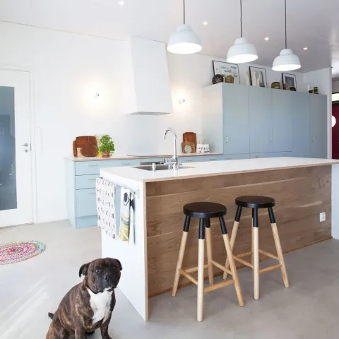 Helena maalasi keittiön seinät ja liesikuvun valkoiseksi puolihimmeällä Luja 20 pintamaalilla. Luja on paras valinta tilaan, joka on alttiina lialle, kosteudelle ja kovalle rasitukselle. Luja 20 sisältää homeenestoainetta, joka antaa pitkäkestoisen suojan homeiden kasvua vastaan. Aina keittiön välitilaan ei tarvita laatoitusta tai lasilevyä, vaan voit käyttää myös Luja-pintamaalia.