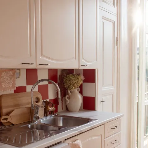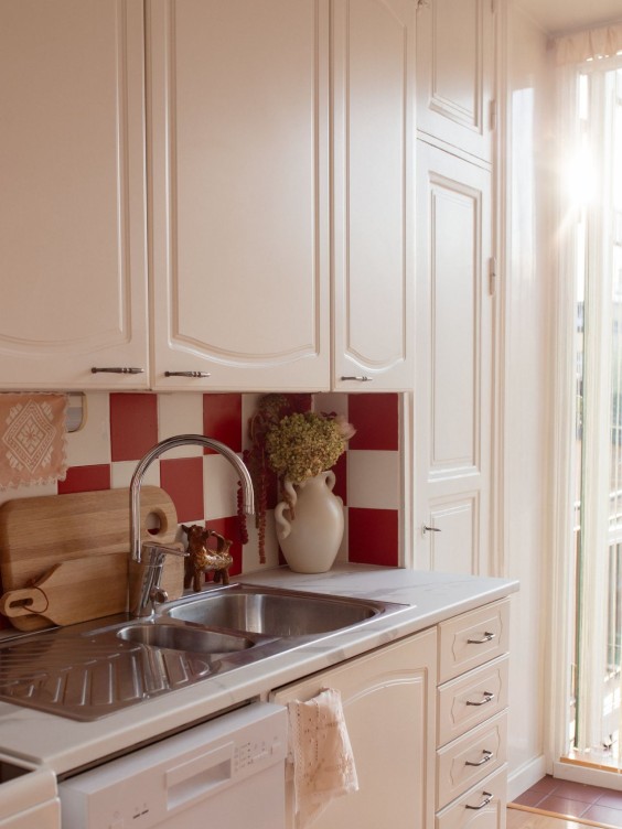 Tässä keittiössä voi aistia pariisilaisen tunnelman ja haistaa espresson tuoksun. Katso kuinka keittiön ilme muuttui, kun välitilan laattoihin maalattiin ajaton ja klassinen ruutukuvio.