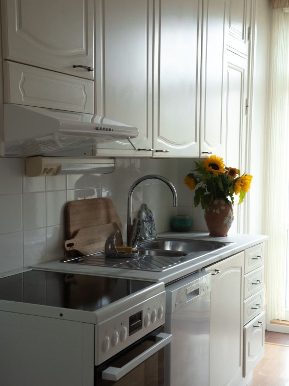 Tämä boheemi, hienostunut ja ajaton keittiö henkii pariisilaista tunnelmaa. Keittiössä yhdistyvät kauniisti moderni ja vintage tyyli luoden tasapainoisen kokonaisuuden. Keittiössä oli kuitenkin yksi yksityiskohta, joka ei aivan vastannut keittiössä touhuavaa värikästä persoonaa: valkoinen värimaailma.