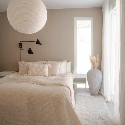 Beige tehosteseinä tekee makuuhuoneen tunnelmasta pehmeän ja kotoisan. Tehosteseinä on maalattu sävyllä V484 Ajopuu, joka on rauhallinen ja hillitty beige, jossa on harmaa vivahde. Tämä sävy sopii tehosteseinän lisäksi myös koko huoneeseen.