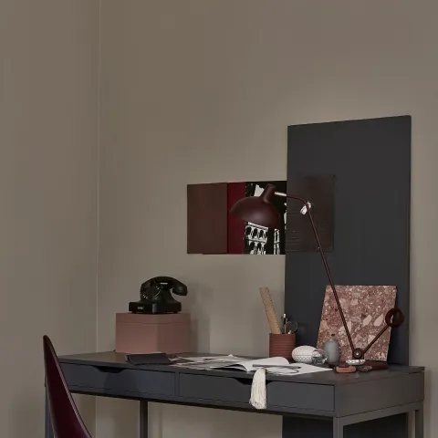 "Tilassa oli aiemmin ollut vaaleanharmaat seinät, jotka tuntuivat kuitenkin liian kylmiltä ja vaaleilta. Idea tummempien sävyjen käyttöön lähti äskettäin Italiaan tehdystä matkasta, jolloin katse kiinnittyi erityisesti punertaviin sävyihin ja Italiassa paljon käytettyihin kivi- ja marmoripintoihin. Työpistenurkkaukseen valikoituivat Minerals-värikokoelman vahvat, mutta tyylikkäät V484 Ajopuu ja Y500 Takorauta."