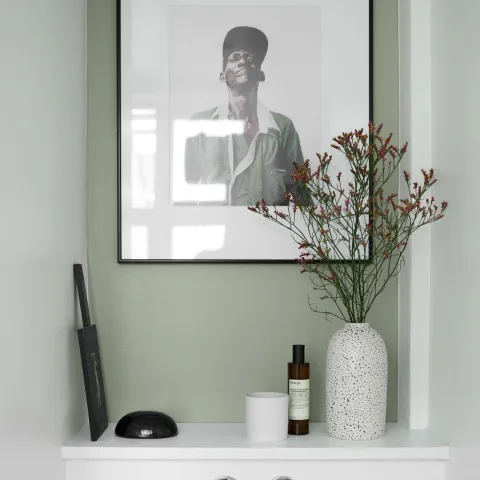 Vihertävä V447 Serpentiini raikastaa kylpyhuoneen takaseinän.