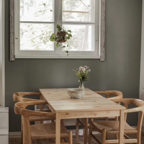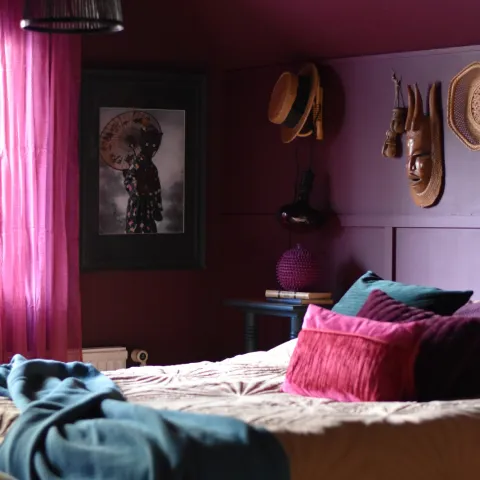 Jos etsit kotiisi tyylikästä, mutta maanläheistä punaista, lempeä ja murrettu N405 Ruukku on sinun sävysi. Jos tunnet olosi rohkeaksi ja etsit tummempaa punaista, valitse M425 Punajuuri. Tämä voi tuntua melko hurjalta, mutta maalaa Punajuurella koko huone, kuten alla olevassa kuvassa. Lopputulos on kotoisa ja antaa lohtua.