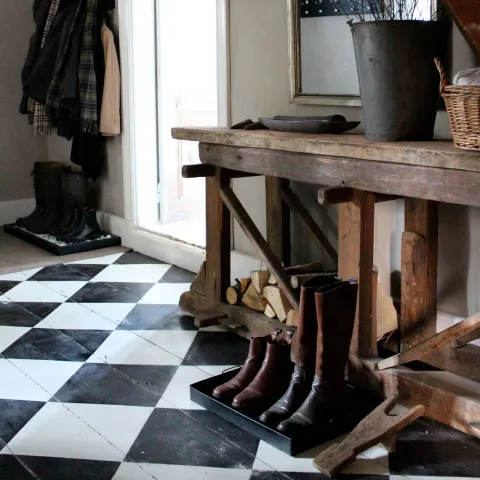 Kuvan puulattiaan on maalattu mustavalkoinen shakkikuvio Betolux Akva -lattiamaalilla