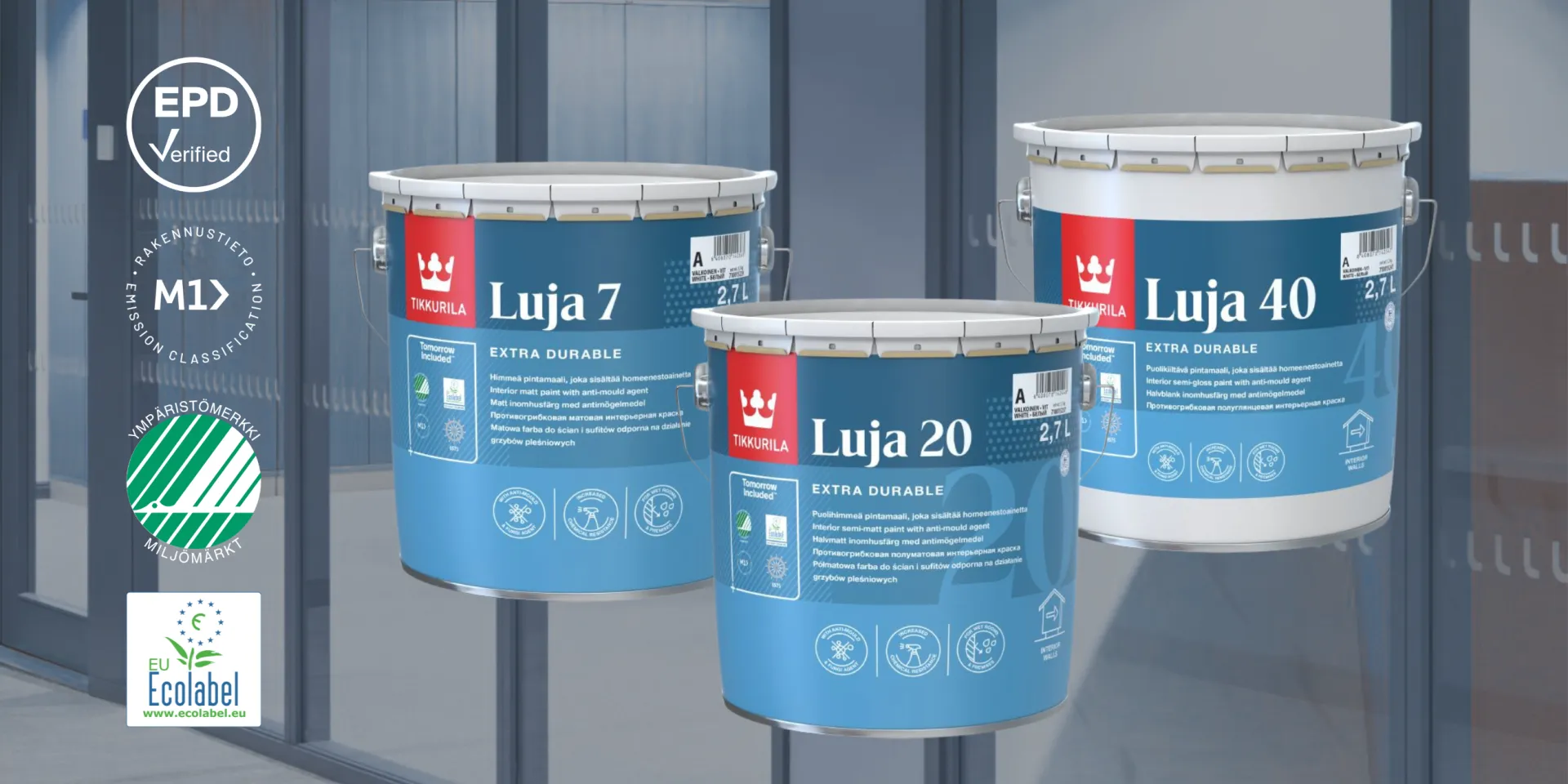 Luja-sarjan seinä- ja kattomaali on paras valinta tiloihin, joissa pesun- ja kulutuksenkestävyys on erityisen tärkeää. Kosteisiin tiloihin Luja on erinomainen valinta, sillä sen homeenestoaineet suojaavat maalipintaa pitkään. Luja-maalit ovat vähäpäästöisiä ja ympäristöystävällisiä: ne täyttävät Joutsenmerkin ja EU-ympäristömerkin tiukat kriteerit sekä ovat EPD-sertifioituja, M1-luokiteltuja ja MED-hyväksyttyjä.