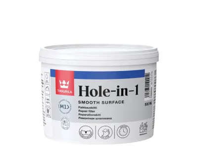 Lue lisääHole-in-1 on hetivalmis erikoiskevyt paikkauskitti, joka sopii betoni-, kevytbetoni-, rappa- ja tasoitepinnoille, yleisimmille rakennuslevyille sekä aiemmin maalatuille pinnoille. Paikkauskittiä on helppo hioa ja se on helposti päällemaalattavissa seinäpintamaaleilla. Hole-in-1 -paikkauskitin täyttökyky ilman halkeilua on jopa 50 mm. Täytä kolo tai halkeama kitillä ääriään myöten ja poista teräslastalla kevyesti ylimääräinen kitti pois. Suuremmat paikkaukset kannattaa tehdä kahdella täyttökerralla.