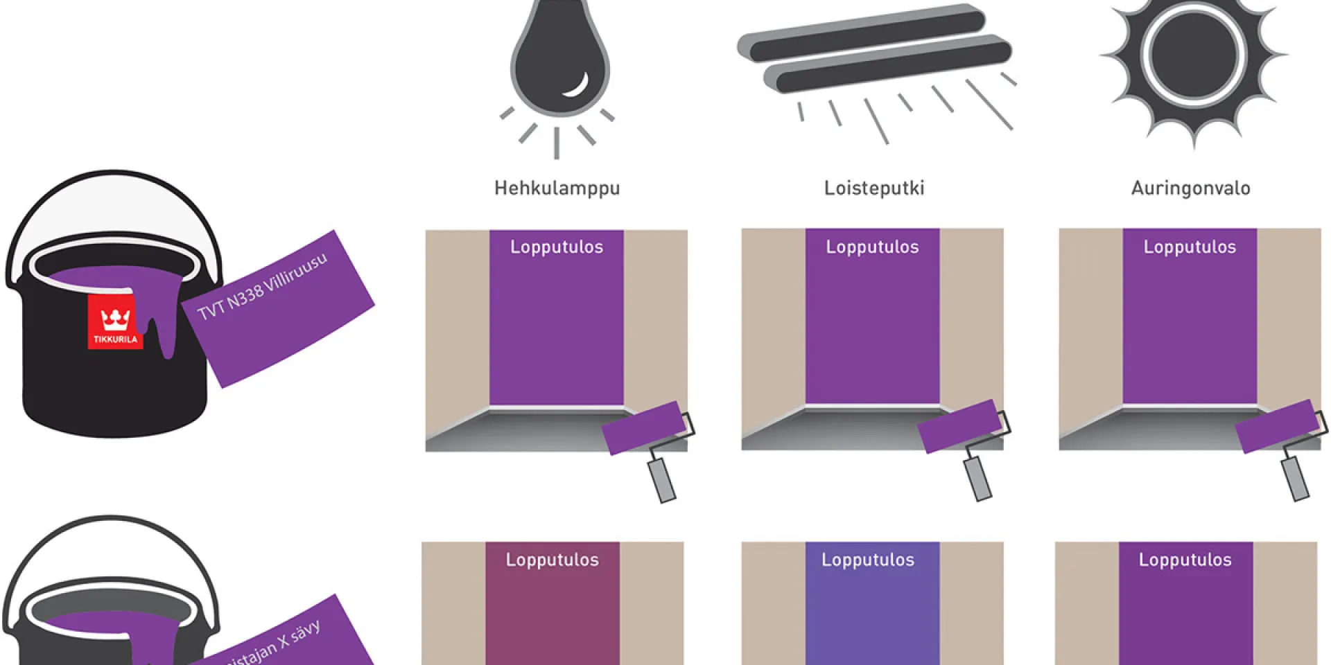 Tikkurilan Color Service tutkimuspäällikön Päivi Luomahaaran mukaan valon vaikutus värin aistimiseen on yksi värin kiehtovista ominaisuuksista. Maalisävyä valitsevalle maalarille, suunnittelijalle tai sisustajalle se voi kuitenkin aiheuttaa haasteita. Luomahaara vertaa tilannetta ostosreissuun, jonka tarkoituksena on hankkia sävysävyyn oleva paita uuden ruskean takin kaveriksi. Paita, joka sovituskopissa näyttää hyvältä ja takin sävyyn sopivalta, voikin ulkona näyttää vihreältä ja takki edelleen ruskealta.