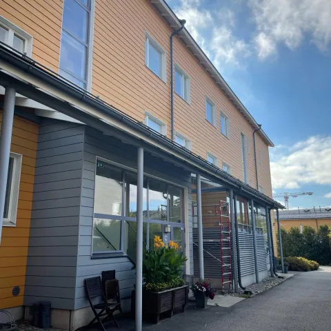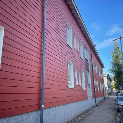 Porvoolaisen pienkerrostalon julkisivun puupaneeleita oli halkeillut, kiinnityksiä oli jouduttu uusimaan ja maalipinta oli kulunut säärasituksen seurauksena. Koska alueella rakentamistapaohjeet määrittävät tarkasti puujulkisivujen maalityypit ja kiiltoasteet, huoltomaalausratkaisun tuli olla paitsi teknisesti kestävä myös alueen ilmeeseen sopiva.