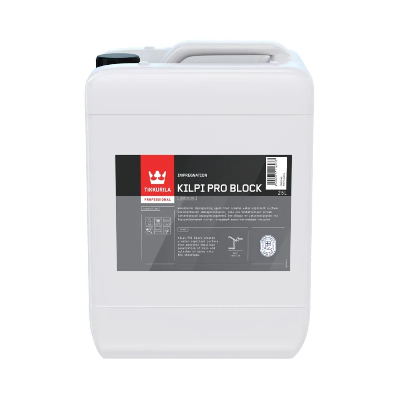 Kilpi PRO Block on väritön vesiohenteinen suoja-aine joka imeytyy hyvin alustaan ja reagoi alustan kanssa kemiallisesti. Soveltuu hyvin tiiviille mineraalialustoille. Muodostaa vettähylkivän pinnan joka estää sade- ja roiskeveden kapillaarista tunkeutumista rakenteeseen. Päästää sisäpuolelta höyrynä tulevan kosteuden lävitse. Vähentää suolojen kulkeutumista rakenteen pintaan. Ei muodosta näkyvää kalvoa. Vähentää levien ja kasvillisuuden kasvua pinnalla sekä ehkäisee pakkasvaurioita.