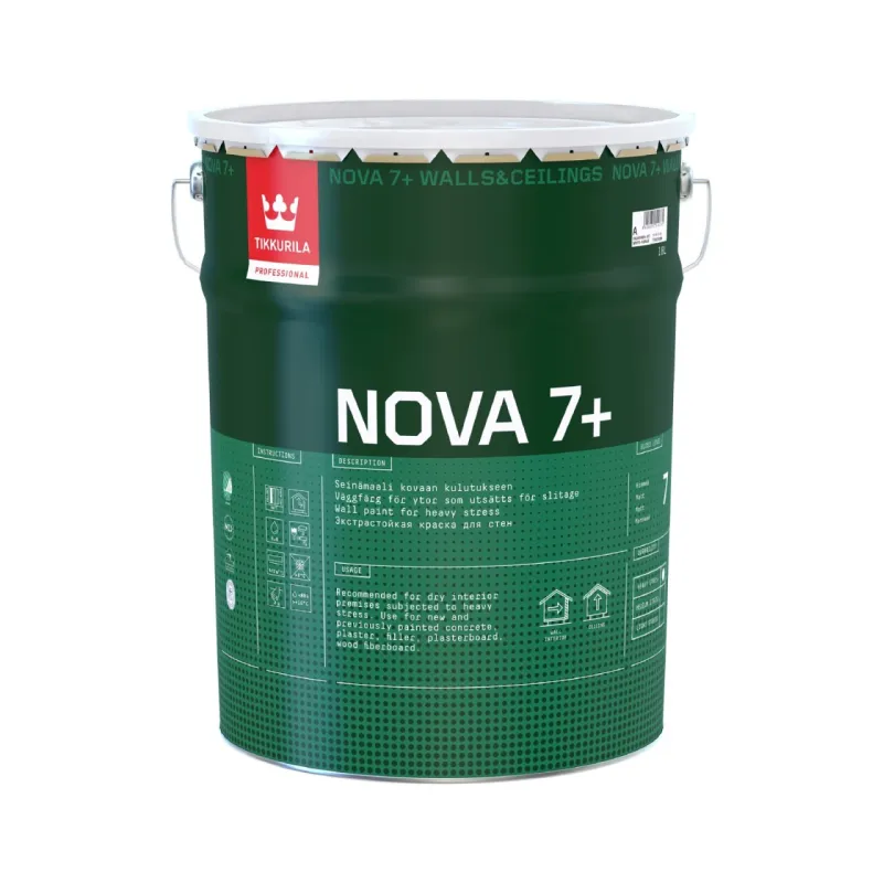 Nova 7+ soveltuu erityisesti porrashuoneiden, asuin- ja toimistotilojen sisäseinien ja -kattojen maalaukseen. Tuote soveltuu rasitusluokan 04 tiloihin ja kestää pesua sekä mekaanista rasitusta erittäin hyvin.
