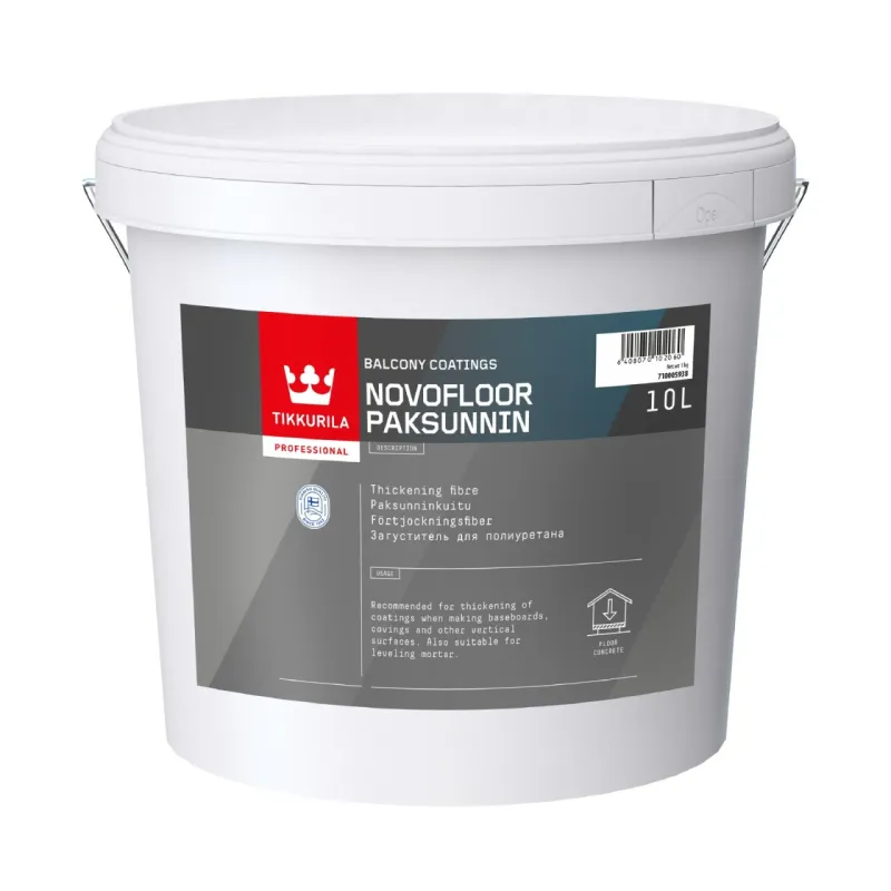 Paksunninkuitu, jota käytetään Novofloor- ja Temafloor-pinnoitteiden paksuntamiseen, kun tehdään jalkalistoja, otsapintoja ja muita pystypintoja. Ei muuta pinnoitteen värisävyä.