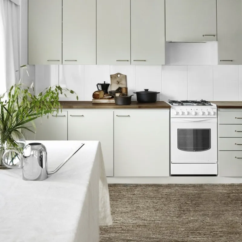 Kun vaalea savi kohtaa hennon vihreän. Vaalea yleisväri, jossa harmaa ja ripaus vihreää vuorottelevat valon leikkiessä tilassa.