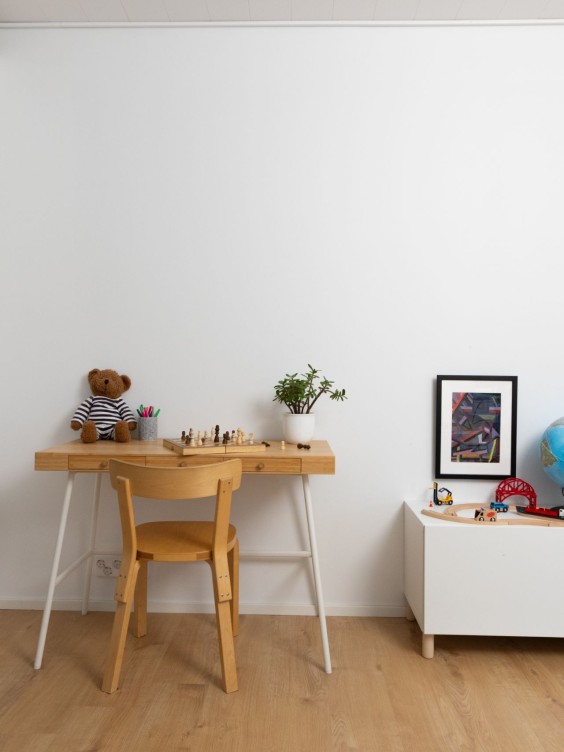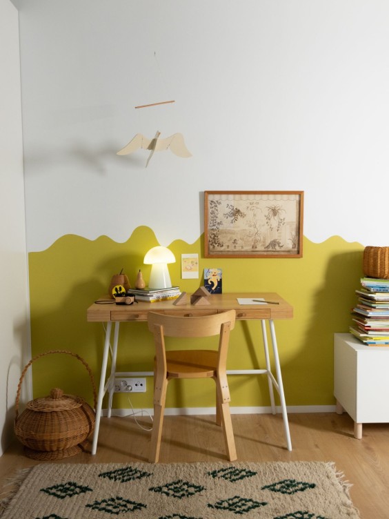 Lastenhuoneeseen muodonmuutos toteutettiin maalaamalla seinän alaosaan leikkisä aaltoileva kuvio, joka piristää koko tilan ilmettä ja tekee siitä harkitun. Keltavihreä L391 Kameleontti tuo niin iloa lastenhuoneeseen kuin rauhaa koululaisen huoneeseen. Kameleontin luonnonläheinen sävy miellyttää myös aikuisen silmää.