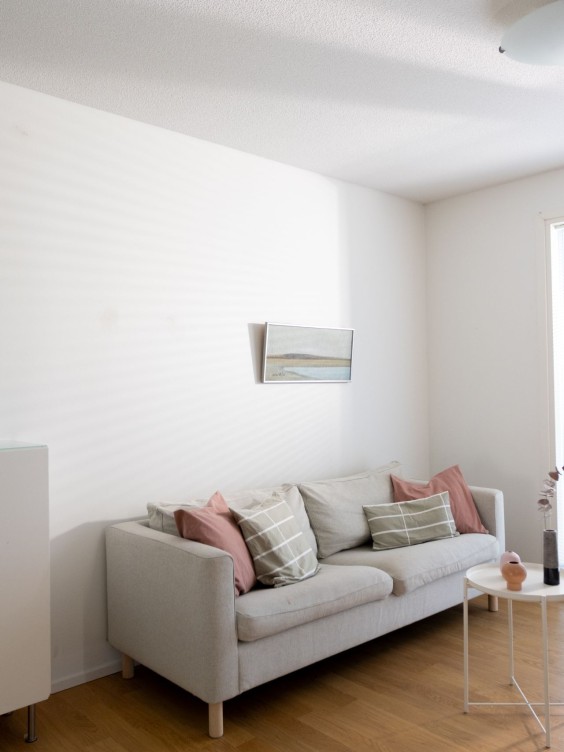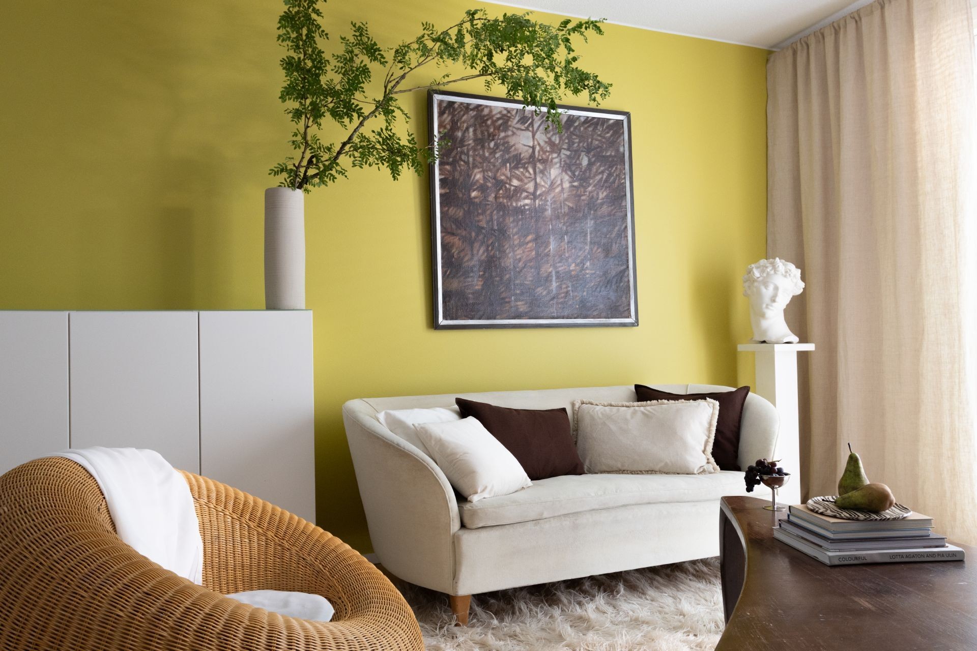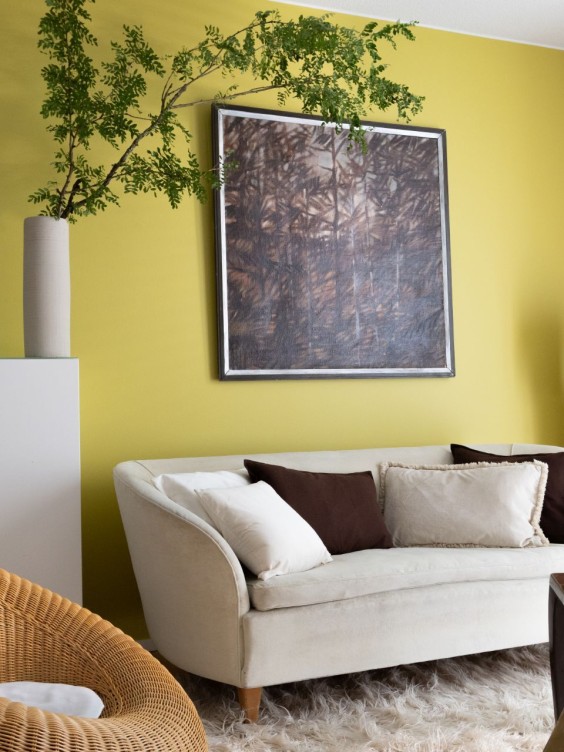 Vaalea olohuone kaipasi muutosta. Olohuoneen seinän maalaaminen keltavihreällä Kameleontilla nosti neutraalin väriset huonekalut ja esineet kauniisti esiin. Myös viherkasvien sävyt korostuvat nyt uudella tavalla. Yksi tehoseinä riitti tekemään tilasta viihtyisän ja mieleenpainuvan.