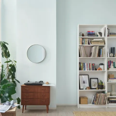 Viileää sinivihreää makuuhuoneeseen, jossa rentoutuminen ja palautuminen on tärkein tavoite. Nämä täydelliset vaaleanvihreän ja sinisen sävyt rauhoittavat sinua kuin kehtolaulu, jota kuuntelit lapsuudessa. Takaseinä on maalattu värillä H441 Pasaatituuli ja seinä edessä Väinönputki F452.