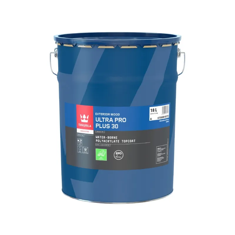 • Ultra Pro Plus 30 edustaa markkinoiden parasta mahdollista laatua. Sen kestävyys ja säänkesto ovat omaa luokkaansa. Maali pidentää huomattavasti ulkoverhouksen käyttöikää. • Suojaa puuta erittäin hyvin veden tunkeutumiselta ja estää puun halkeilemista myös ehkäisemällä veden tunkeutumista reunakohdista. Maalia voidaan käyttää sekä pohja- että pintamaalina. • 2 x Ultra Pro Plus 30 antaa erinomaisen suojan veden tunkeutumista vastaan, ja vähentää siten puun halkeilua estämällä veden kuluttavaa vaikutusta myös reunoissa. • Tuotteella on ympäristöseloste (EPD) standardien EN 15804+A2 & ISO 14025 / ISO 21930 mukaisesti. • Soveltuu nopeille tuotantolinjoille sekä kuivaukseen korotetussa lämpötilassa. Voidaan kuivata myös huoneenlämmössä. • Sisältää alkydiä, jolloin tarttuu paremmin paljaaseen puuhun. • Hidastaa oksakohtien aiheuttamaa tanniinien läpilyöntia ja sen aiheuttamaa värjääntymistä.