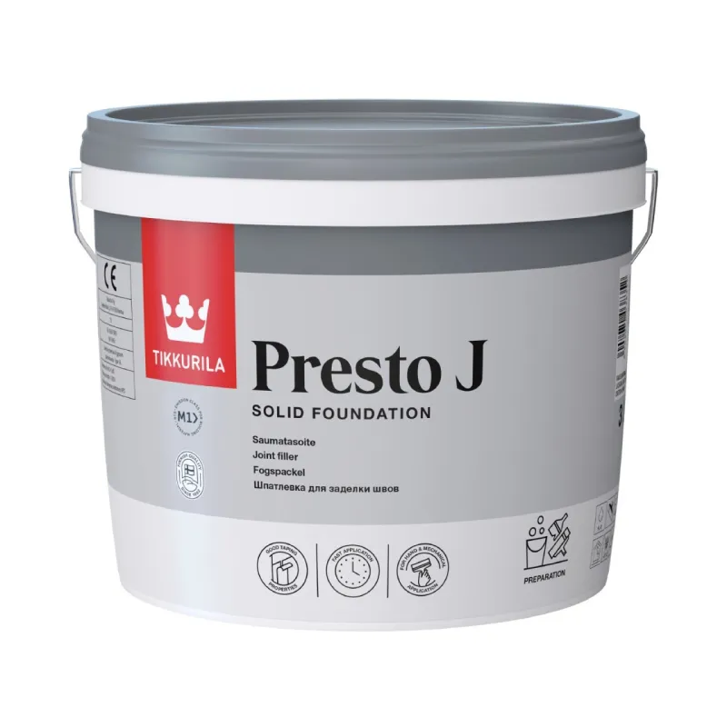 Vähäisen kutistumisen ja erinomaisen tarttuvuuden lisäksi Presto J saumatasoitteella on hyvät kiinnitysominaisuudet. Käytetään kipsilevyjen saumaukseen ja erityisesti saumanauhan kiinnitykseen.