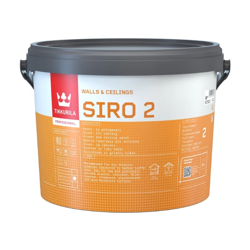 Siro 2 -maalia saa valkoisena. Maali voidaan sävyttää myös Tikkurilan Symphony 2436 -värikartan vaaleisiin väreihin.