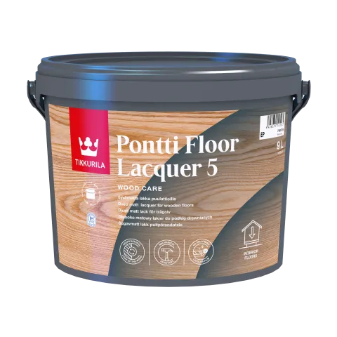 Pontti Floor Lacquer 5 -puulattialakka on Pontti-tuoteperheen uusin jäsen. Pontti Floor Lacquer 5 on vesiohenteinen lakka, joka antaa puulle kellastumattoman mattaisen pinnan ja samalla säilyttää puun luonnollisen ulkonäön. Lisäksi lakka antaa puupinnalle suojaa sekä uuden raikkaan ilmeen. Pontti Floor Lacquer 5 -puulattialakka soveltuu puu- ja parkettilattioiden lisäksi myös puisien kynnyksien ja portaiden lakkaamiseen.