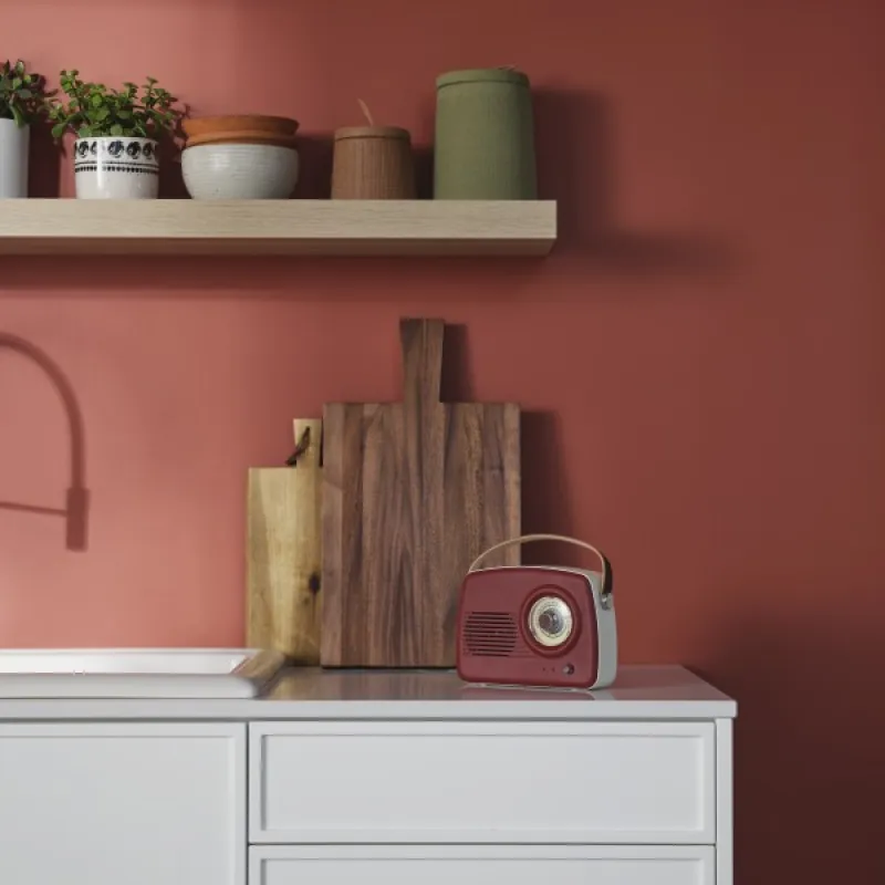 Valo osuu punaisiksi rapattuihin seiniin ja saa ne hehkumaan. Intensiivinen punaisen maan, poltetun saven ja lämpimien mausteiden sävy.