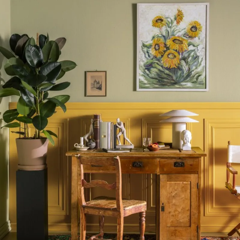 Valo siivilöityy kauniisti oliivipuun lehtien läpi. Keltaiseen taittuva murrettu vihreä ohjaa katsetta. Oliivilehto tekee tilasta harmonisen.