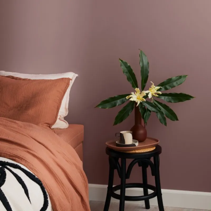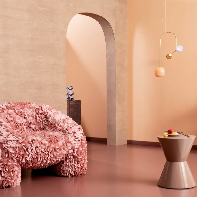 Salongin upottavat plyysisohvat kutsuvat iltapäiväteelle. Punertava, liilaan taittava beige saa tilan tuntumaan unenomaiselta ja arvoitukselliselta.